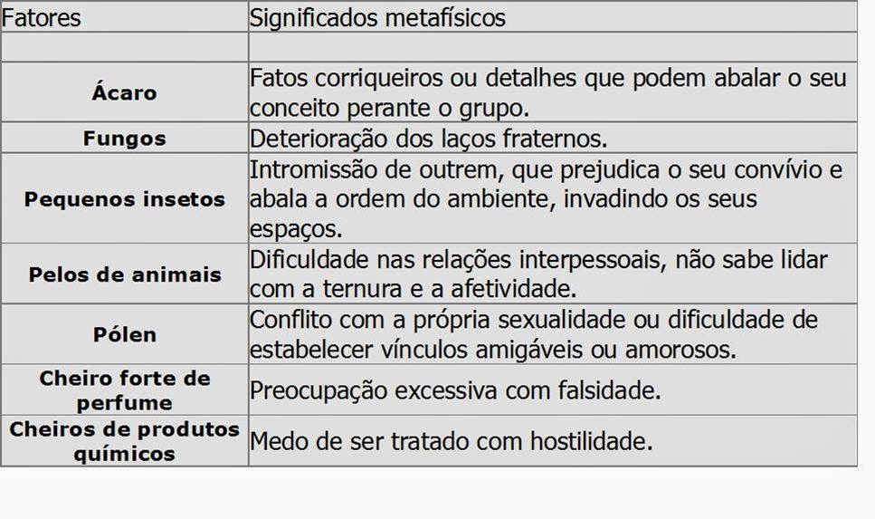 Dentro da metafísica, a alergia consiste em uma estado de alerta e exagerada prontidão frente a determinadas situações existenciais. Aparentemente os alérgicos são ousados e dispostos ao confronto, é muito difícil que se reprimam ou se escondam, mostram-se ansiosas, nervosas e irritadas diante das adversidades. Mas toda essa agitação interior e os comportamentos que não medem muito as consequências, são apenas a forma inconsciente que encontraram de não mostrar sua insegurança e medo.